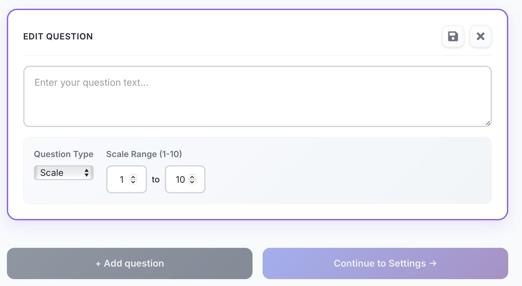Each question type is easy to configure — just enter your text, add options (when applicable), and save.