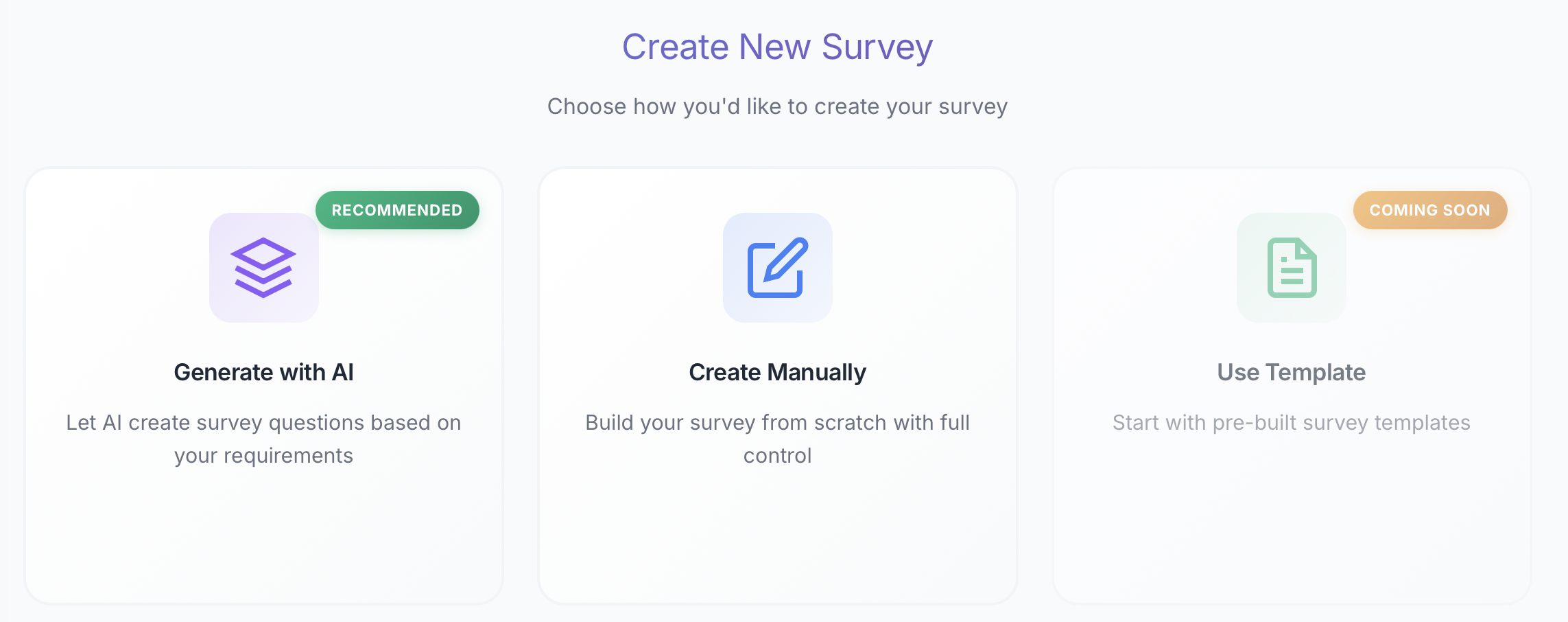 Our platform supports two main survey creation modes: AI-generated survey creation and Manual survey creation. Both methods are optimized for speed and clarity.
