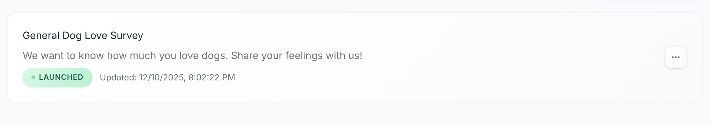 Once you're satisfied with your survey, navigate to your survey card in the dashboard. Click the three dots (•••) on the right side of the survey card, then select "Launch."